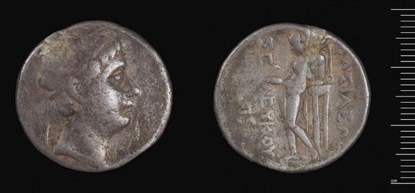 Curator: Here we have a Drachm, a silver coin, bearing the likeness of Ariobarzanes I. Its worn surface whispers tales of ancient Cappadocia. Editor: There's something haunting about the profile, isn't there? A stoic gaze cast in aged silver. I wonder about the power dynamics inherent in circulating an image of leadership. Curator: Precisely. Consider the material—silver. Its extraction, its minting: these processes held immense economic and social weight. Minting coinage solidified power. Editor: Absolutely. Currency as propaganda, fixing the ruler's image in the everyday lives of his subjects. What was the function of the deity depicted on the reverse side? Curator: It's crucial to recognize this coin as more than just currency; it’s a tangible record of craft, labor, and royal authority inextricably linked. Editor: Yes, a potent reminder that even the smallest objects can carry the weight of empires and ideologies. The circulation is really what determined how it was used. Curator: A fascinating look at how material culture helps us understand the past. Editor: Indeed, a pocket-sized portal into ancient political theater.