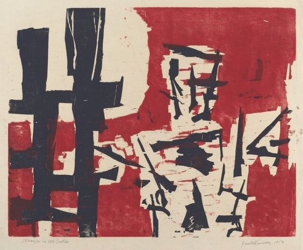 Curator: Here we have Pierre Soulages’s "Etching No. 2", held within the Tate Collections. Soulages, born in 1919 and passing in 2022, left an undeniable mark on abstract art. Editor: The bold strokes of black and the occasional touch of red feel both raw and meticulously crafted. It’s like looking at the architecture of emotion itself. Curator: And it's important to see how Soulages challenges traditional boundaries, elevating the "craft" of etching to high art. Editor: Absolutely. The plate-making process itself dictates the marks, the way the acid bites into the metal, a kind of collaboration between artist and material. It demands a new appreciation of labor. Curator: Indeed, Soulages's work gained prominence during a time of significant shifts in the art world, reflecting the wider sociopolitical movements of the 20th century. Editor: Seeing it this way makes me realize that it isn't just abstract expression; it's a record of the artist's physical actions, the tools used, and the materials transformed. Curator: Yes, and by understanding the art's role within its historical moment, we can more fully appreciate the complexity of its reception. Editor: I'll leave with a newfound appreciation for the physicality inherent in printmaking.