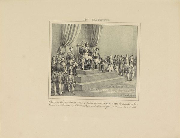 Curator: Let's discuss this striking albumen print entitled "Portret van de maharadja van Bharatpur tijdens een durbar", capturing a durbar—a formal assembly—sometime before 1874. It's attributed to the studio of Shepherd & Robertson. What's your initial response to the imagery? Editor: It projects such formal power. But look closer, and I sense tension. It feels less like celebration, more like a staged declaration—power carefully curated, each figure deliberately positioned, yet perhaps a bit uneasy under the colonial gaze implied in the photograph itself. Curator: Absolutely. The durbar was a ritual saturated with symbolic weight, from the attire and posture of the Maharaja, alluding to lineage and divine kingship, to the layout indicating social hierarchy, a visual order of the cosmos reflected on earth. We need to consider that such events are acts of self-representation within systems of British Colonial influence. The very act of photographing such an assembly turns the whole setting into a staged construction. Editor: And notice how the light, in that pre-electric era, throws long shadows. While realism is clear here, I question whose “reality” this captures, whose story it actually tells. The camera's gaze intersects with political forces—what gets seen, what gets hidden, whose voice carries across the archive. I see those layers of power dynamics at play in what would otherwise seem just to document this durbar, this photograph freezes, codifies, and thus transforms lived events and ongoing historical realities into fixed imagery and perhaps oversimplified historical truths. Curator: You’ve pointed out some insightful nuances. It calls forth questions about image manipulation and preservation of colonial legacies within photographical practice, as it seems the event was being staged as evidence, rather than only the capturing of a likeness. Considering our present-day re-evaluations, how might people interact with imagery carrying embedded symbols from this period of British colonial influence? Editor: I think we’re past passive reception. Audiences engage critically now, demanding acknowledgement of historical oppressions, seeing representations not as neutral mirrors but as sites of ongoing ideological struggle. The photographic truth itself is never an isolated and single narrative, but we learn and build by examining various critical angles on images such as these. Curator: Indeed, it offers pathways for reinterpreting cultural memory. It’s intriguing how this static, sepia-toned image can stimulate conversations about present-day debates of power, identity, and colonial narratives, wouldn't you agree? Editor: Precisely. By engaging critically, we disrupt simplified readings. We resist the singular "truth," embracing diverse narratives and honoring the complexity embedded within history.