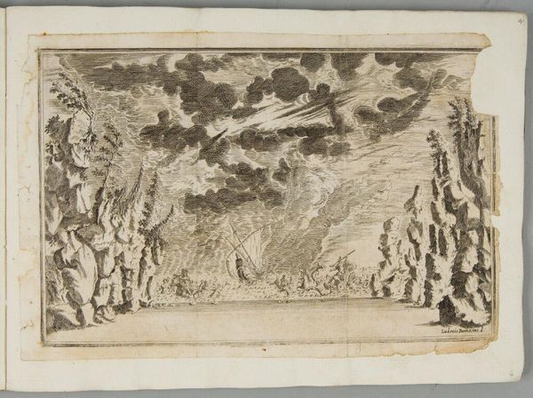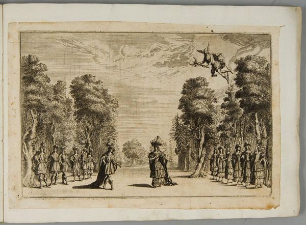 Editor: This is Matthäus Küsel's "Marsh of Triton," a plate etching. The symmetry is compelling, but the scene feels a bit unsettling, like a stage for something ominous. What do you see in this piece? Curator: It certainly invites questions about power and performance. Consider the elevated figure of Triton presiding over what appears to be a ritual or staged combat. How might this relate to societal hierarchies and the justification of violence in the artist's time? Editor: So, not just a decorative scene? Curator: Precisely. Etchings like these circulated widely. Who was the intended audience, and what messages about authority might they have taken away? Perhaps it's about understanding power, in this case, the figure in the clouds using theatre. Editor: That reframes everything. I'll never look at old prints the same way again.