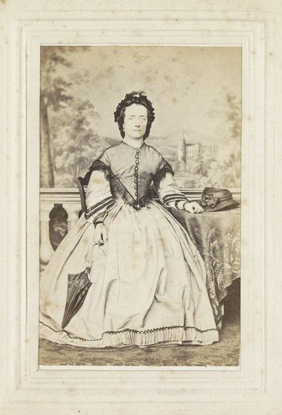 Editor: Here we have "The Empress of Austria," a photograph from the 1860s. It’s an albumen print currently held at The Art Institute of Chicago. It's a portrait that somehow feels both intimate and incredibly distant. The frills and the stillness create this very controlled and untouchable image. What do you see when you look at this portrait? Curator: Oh, that stillness, it whispers volumes, doesn’t it? Imagine, if you will, stepping into that era, the 1860s – a world grappling with nascent photography and rigid social structures. This isn’t just a portrait; it's a performance, a carefully constructed image of power and grace. It reminds me a bit of a Jane Austen novel; underneath the frothy dress and posed composure, what tensions do you think are simmering? Editor: I guess I hadn't thought about the tensions so much. It seemed mostly serene. Maybe even sad? Curator: Sadness is a lovely entry point. Consider the Empress Elizabeth, known as Sisi; her life was hardly a fairytale. The photograph, an albumen print – painstakingly produced – served as propaganda, a constructed reality. Note how her dress, all frills and lace, creates a barrier, emphasizing her separation from the viewer, from her people, perhaps even from herself. Photography, then, becomes this intriguing dance between truth and fabrication. Don’t you think? Editor: So, it's a document but also a fiction in some ways? I see what you mean about the barrier – she's right there, but so inaccessible. Curator: Exactly! The camera promised reality, but early photographers crafted their images. Perhaps Sisi, trapped by her role, found herself performing even in a ‘realistic’ photograph. We read her face searching for authentic expression. Knowing something about the world in which it was made adds another layer of complexity and emotional power. I hadn’t considered her potential sadness quite like that. It adds another interesting layer to my appreciation. Editor: This has totally shifted my perspective on portraits – the fiction and performance behind them, not just the 'truth.' Thanks!