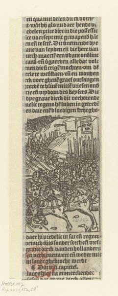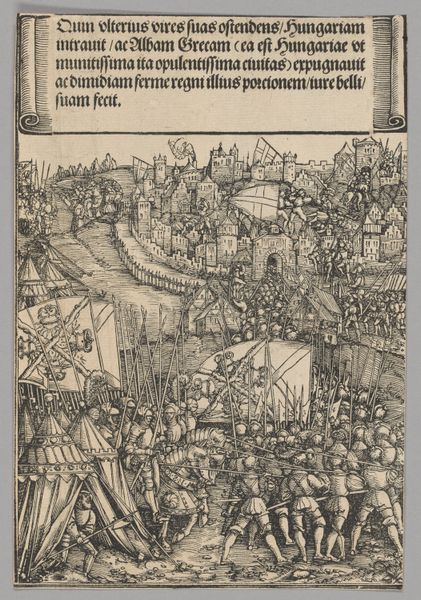Curator: Look at this intriguing print, “Second Flemish Rebellion, plate 10 from Historical Scenes from the Life of Emperor Maximilian I from the Triumphal Arch,” made around 1515-1520 by Hans Springinklee. It’s currently held at The Art Institute of Chicago, a woodcut using ink on paper. Editor: It has a remarkable density of line, doesn’t it? Almost overwhelming at first glance, that mass of figures compressed into a shallow foreground. The use of stark contrast really amplifies the chaos of battle. Curator: Indeed. Springinklee meticulously renders the conflict. Consider the iconography embedded in the image – the massed pikes evoking a forest of righteous indignation, while the broken figures at the front hint at defeat, suggesting both earthly struggle and a fall from grace, given the historical context of the Habsburg empire’s struggles to maintain power in the Netherlands. Editor: The compression, though… it's almost claustrophobic. It denies the eye any real respite. It’s interesting how the text banner at the top adds to this effect. I wonder about its intention to shape our interpretation through semiotic inscription? Curator: Exactly! The text provides context, of course—reinforcing the emperor’s narrative and justifying his actions against those resisting. Visually, the soldiers are not individualized heroes. Springinklee instead creates archetypes representing the strength of the Emperor’s army and alludes to universal ideas of power, rebellion, and divine right. Editor: Despite the chaos, notice how he’s orchestrated it all, funneling the action towards that central gate in the background? A masterful composition, directing the viewer's eye amidst the seemingly disordered scene, subtly manipulating the chaos. Curator: It is more than just observation, it’s a potent visual declaration. I think of the image serving to warn of consequences to defying imperial authority, reflecting period sensibilities towards empire and legacy. Editor: The visual and conceptual layering in this piece speaks volumes. Thank you for shedding light on the embedded messages of the era and its psychological manipulations! Curator: The artist definitely captures something essential here about that period’s perception of political struggle. Hopefully, this gives everyone insight into the artistic approach!