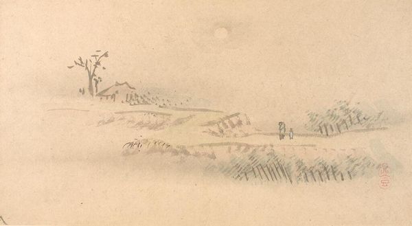 Curator: Hiroshige's "Cherry Trees at Koganei," a print held at the Harvard Art Museums, captures a landscape imbued with cultural significance. Editor: My first thought is that it looks like a memory. Faded ink, a gentle panorama. It gives me a feeling of nostalgia. Curator: Indeed. Cherry blossoms are potent symbols, representing the ephemeral nature of life. Notice how the composition places the viewer above the scene, like an omniscient observer. Editor: Yes, the trees themselves are like fleeting thoughts. Bare branches reaching, a reminder of winter, but full of potential, promising the burst of spring. I feel grounded yet floating. Curator: And that, perhaps, is the enduring power of Hiroshige's work. He captures not just a place, but a feeling, a moment caught in time. Editor: Absolutely. It's a visual haiku, really. A fleeting, beautiful, resonant glimpse.
