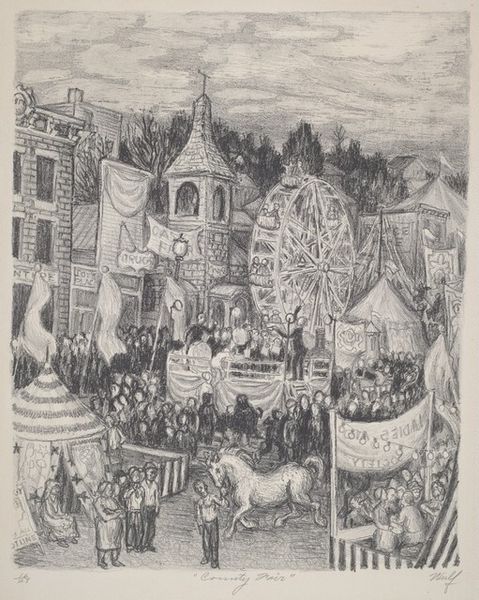 Paul Feldhaus made this print, titled 'The Circus', using etching; a process of mark-making that is driven by process and chance. Look at the mass of figures at the bottom – they are just dark, scribbled silhouettes, capturing the excitement of the crowd. The material aspect of etching creates a unique surface. The lines are not just on the surface but bitten into the metal, giving a tactile depth. Notice how Feldhaus uses hatching and cross-hatching to build up tone, especially in the dark areas under the tents, creating a sense of depth and mystery. The little flags and stars atop each tent are rendered with such quick, scratchy marks; this adds a sense of spontaneity and energy. There’s something reminiscent of Max Beckmann in the way Feldhaus captures the frenetic energy of the circus, but with a folksy, American twist. Art's not about nailing down one meaning. It’s more like a conversation, always open to new voices and interpretations.