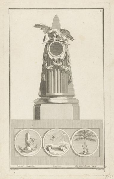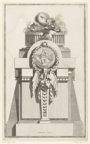 Curator: Oh, this piece makes my head swim—in a delightful way. I feel like I've just walked into an architect's dream… or maybe their beautifully precise nightmare. Editor: Indeed. Here we have "Israëliërs," an engraving by Jean Charles Delafosse, created between 1768 and 1771. It is currently held at the Rijksmuseum. What grabs you initially about this work? Curator: Its coldness! The overwhelming structure… I sense more math than matter here. It’s a beautifully rendered diagram, almost aggressively balanced. Look at the shadows! But the tiny details above that base – that ornate crest and strange circular cameo. A world of swirling mythology perched on absolute, geometric rigidity. It tickles me. Editor: That cameo actually reflects the allegorical nature of much Neoclassical art. Its inclusion adds another layer to understanding its structure, offering not only shapes but stories and cultural messages through carefully arranged forms. Curator: Allegory? Sure, but let’s not ignore the aesthetic whackiness of it all! This isn’t some serene landscape. I see someone pushing the boundaries of “form,” piling symbolic objects, tossing a chaotic vignette onto an impassive pyramid. Like throwing a party on a perfectly laid foundation. Is the composition really celebrating form or lampooning it, in a cheeky way? Editor: An interesting thought... Given the meticulous detail, though, it feels like Delafosse celebrates academic form in general. He displays mastery, adhering to rules while engaging playfully with line and tone within those constraints. Curator: Hmm, the piece whispers rebellion to me, subtle as it might be. Delafosse is doing more than flexing his draughtsmanship here. I think he's playing. Editor: Whether Delafosse sought conformity or controversy, his approach certainly presents something unique for us to consider in his structured design! Curator: That's why, after looking at it, one leaves thinking more expansively than before they laid their eyes on this marvelous feat of draughtsmanship!