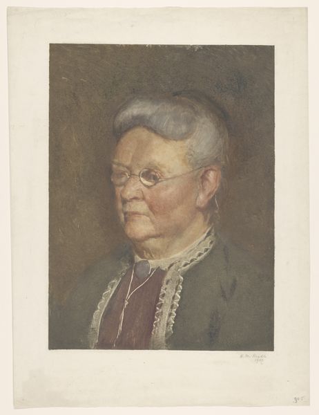 Curator: This is Ida Bothe’s rendering of Lucy Stone, a significant figure in the 19th-century women's rights movement. Editor: The somber palette immediately strikes me. The deep blacks and muted tones lend the portrait an air of quiet dignity. Curator: Indeed, Bothe captures Stone’s resolve. The austere dress and minimal ornamentation speak to Stone’s commitment to social reform, rejecting frivolous displays of wealth. Editor: Observe how the composition guides the eye—the light falls directly on Stone's face, creating a focal point that emphasizes her determined expression. It’s quite masterful. Curator: The portrait's creation likely served a commemorative purpose, solidifying Stone's legacy within abolitionist and suffrage circles. It served as a visual reminder of her powerful influence. Editor: Precisely. It’s a compelling study in how formal elements like light and color can reinforce the historical significance of a subject. I admire the artist's choices. Curator: And I appreciate how the portrait humanizes a figure often mythologized. It reminds us of the individuals behind monumental social change.