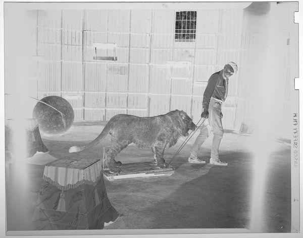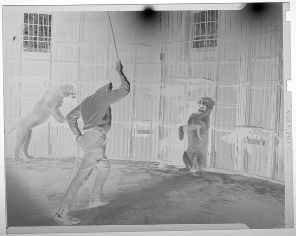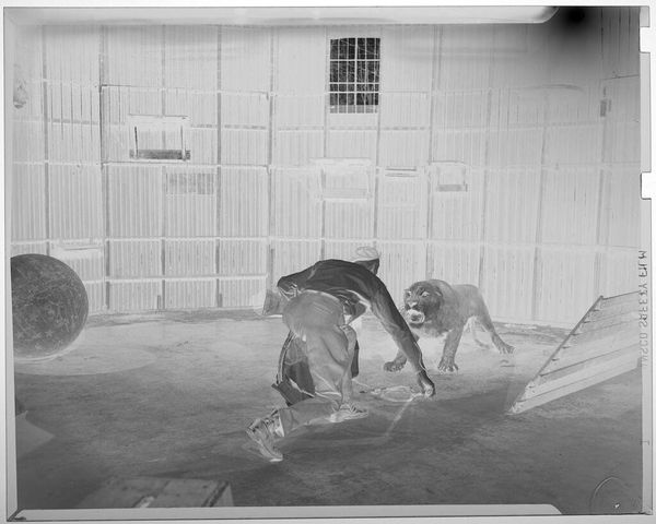 Editor: This photograph by Jack Gould pictures a trainer whipping a lion in a cage. It's unsettling, and the high contrast emphasizes the conflict. What symbols do you see at play here? Curator: The cage itself is a potent symbol—of confinement, control, and the suppression of natural instincts. Note how the lion rears up, its posture a challenge to this domination. This image taps into a long history of representing power dynamics. What historical or cultural associations does this image evoke for you? Editor: I think of gladiatorial combats, or even the idea of taming the "wild" in general. It's a harsh image. Thanks, I hadn't considered the deeper historical links. Curator: Precisely. And by understanding those links, we unlock its enduring power.