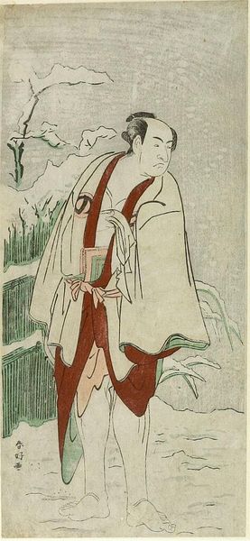 Curator: I'm drawn to the tenderness captured in Torii Kiyonaga's work, particularly in "Youth Lifting Girl with Battledore," presently housed in the Harvard Art Museums. Editor: The composition strikes me as delicate, almost ephemeral. The figures seem light, buoyant, aided by the minimal yet suggestive background. Curator: Kiyonaga, active in the late 18th century, often depicted women in scenes of everyday life, reflecting shifts in social mores and the evolving roles of women in Edo society. This piece speaks to the complex dynamic of adolescence, power, and play. Editor: Thinking about the woodblock printing process itself, the carving and layering, it's a testament to the artisan's skill in conveying such subtle emotion. It speaks to the labor and meticulous craft inherent in ukiyo-e. Curator: Absolutely. Consider the implications of the battledore – a symbol of youthful games, but also suggestive of social interactions and even power dynamics between the youth and the girl. How might we interpret their relationship, given the context of arranged marriages and gender expectations of the era? Editor: It reminds us how even seemingly simple scenes were constructed objects, from the paper it's printed on to the pigments selected. Curator: Indeed. Kiyonaga prompts us to examine the intersections of gender, status, and social performance. Editor: It offers a glimpse into the materials and processes that brought this scene to life.