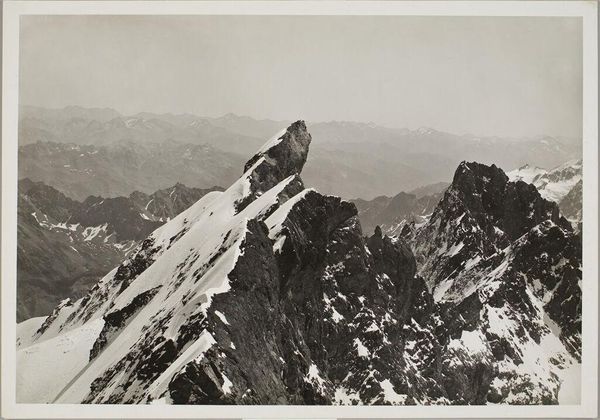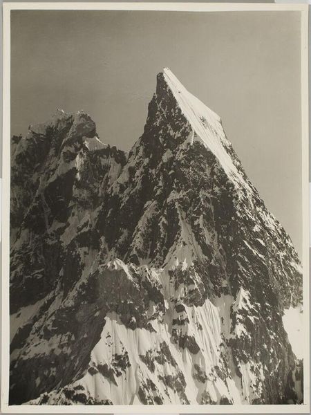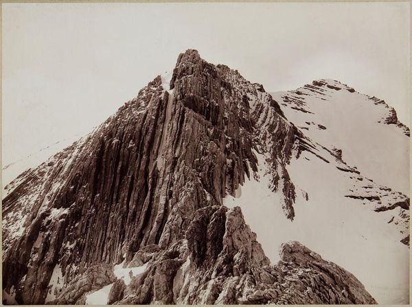 Curator: The stark contrast immediately grabs me – the dark, imposing rock against the bright snow and sky. Editor: This is Vittorio Sella's "Aiguille du Midi, Mt. Blanc Range," an albumen silver print held at the Harvard Art Museums. Sella was a pioneering mountain photographer. Curator: Indeed. His work emerged during a time of intense Alpine exploration and promoted ideas of the sublime. Editor: The composition itself is remarkable. The sheer scale of the mountain is emphasized by the tight framing and dramatic lighting. The textures, from granular rock to the smooth snow, create a powerful visual experience. Curator: And consider how photography, at this time, was essential for legitimizing claims of territorial sovereignty in the Alps. Images like this one fueled public perception of nature and national identity. Editor: It’s a testament to Sella’s skill that he captures both the objective grandeur and the subjective experience of confronting such a landscape. Curator: Absolutely. A powerful intersection of artistry, exploration, and political context.