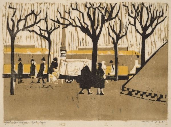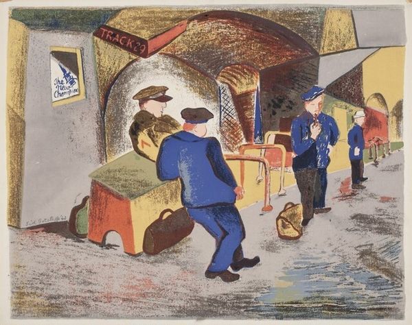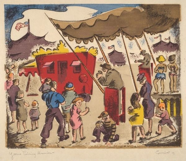 Editor: Here we have L.S. Lowry's 'Punch and Judy', held at the Tate. It looks like a crowded scene, maybe a fair or a park? All those people – what do you see in this piece? Curator: Lowry often depicted industrial landscapes and working-class life. The Punch and Judy show, a form of popular entertainment, becomes a focal point for a community gathering. It highlights the public role of art. How does this image reflect the social fabric of the time? Editor: It feels very observational. Like a snapshot of everyday life. The starkness and the crowds… Did Lowry intend a specific message? Curator: The lack of idealization is striking, isn't it? The 'matchstick men' are part of Lowry’s visual language, reflecting perhaps the anonymity and repetitiveness of industrial life. Does the image evoke any sense of social commentary for you? Editor: I hadn't considered that. It's a lot more complex than I initially thought. Thanks! Curator: Indeed. By examining art in its socio-historical context, it enables us to interpret it more richly.