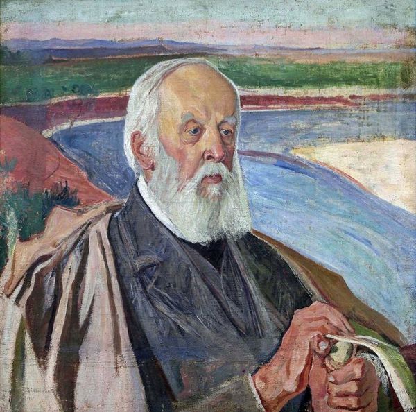 Editor: Dobri Dobrev’s "Portrait of Artist Ivan Mrkvička," painted in 1929 using oil paints, has a certain contemplative stillness to it. The way the light catches his beard makes him seem almost ethereal. What symbols or cultural meanings do you think the artist is trying to convey? Curator: It’s fascinating how portraits, like icons, capture something beyond mere likeness. The beard, for instance, isn’t just facial hair; it’s a signifier of wisdom, age, and experience. Think of religious iconography – beards denote prophets, patriarchs, and wise men. Dobrev, I think, wants to link Mrkvička, also an artist, to this tradition of venerated figures. Editor: So, you see a connection between the visual language of religious art and this secular portrait? Curator: Precisely. And consider the eyeglasses. They're not just functional; they symbolize intellectual insight, scholarly dedication, and artistic vision. In a sense, the portrait becomes a visual biography, a collection of symbolic clues that invite us to decode Mrkvička’s essence. Doesn’t the subdued palette, the greys and browns, reinforce this sense of thoughtful introspection? Editor: I hadn't thought about the glasses in that way, but it's so clear now! The subdued colors certainly create that contemplative mood. I was mostly looking at this as just a "portrait". Curator: See how looking for symbolic weight changes the work! It moves beyond simply rendering appearance. Editor: I’ll definitely remember to look beyond the surface and consider the symbolic meaning in other artworks as well. This was illuminating! Curator: And I learned to see the quiet, still contemplation of the sitter in a new light, too!