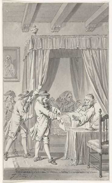 Honoré Daumier created this lithograph, "La cour rend des services et non pas des arrêts!", using precise lines to craft a scene of stark social critique. The contrast of light and shadow enhances the drama, drawing our eyes to the figures and their expressions. The composition divides the space into zones of tension. A figure on the left, formally dressed, stands rigidly; while a figure in the middle, lies on a bed. The judge figure extends a hand, which visually suggests an offer, but his stance hints at manipulation rather than genuine assistance. Daumier uses semiotic codes of dress to denote status and power, which challenges the notion of justice as impartial. The lithograph destabilizes the perceived integrity of the judicial system by exposing its underlying structures of power. The use of caricature heightens the sense of irony, questioning fixed meanings and inviting us to reconsider the values and categories that society upholds. This piece functions as a powerful commentary on cultural and philosophical issues embedded within the legal system.