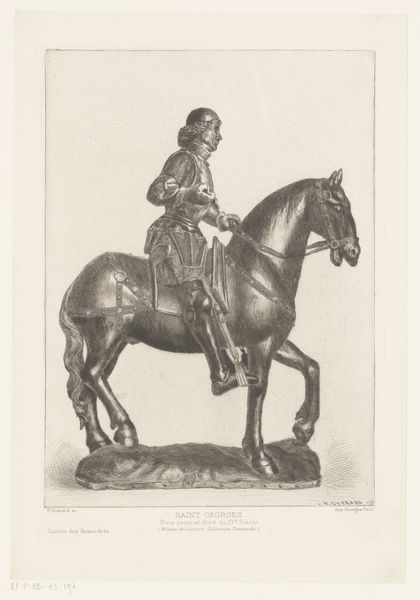 Curator: William Bromley produced this striking image of George III, King of England, in 1798. Executed in charcoal and engraving, it's a commanding portrait. Editor: Indeed. The first thing I notice is its slightly mournful quality, even though it is neoclassical in nature and presents us with a king atop a majestic steed. The grayscale rendering really accentuates the subject's melancholic air. Curator: Note how Bromley employs chiaroscuro to define the musculature of both horse and rider. There’s a deliberate echoing of form—the king's composed posture mirroring the horse's poised stance, both set against a softened landscape. Editor: The composition has political implications as well. This work evokes images of Roman emperors of old by appropriating visual markers of power and dominance. It would serve to bolster a king whose empire was experiencing unprecedented challenges. What do you think? Curator: I agree that it uses established visual language for authority. However, by stripping away color, Bromley invites us to examine the core structure—the interlocking shapes, the delicate hatching that builds volume. The essence lies in the relationships between forms. Editor: It's hard to divorce such an image from its historic circumstances though. Consider the burgeoning ideas of liberty circulating at the time. How might a citizen have responded to a picture meant to exude monarchical power during such a tumultuous era? This artwork engages in the debates around what power looks like, and perhaps inadvertently reveals its fragility in a time of revolutionary fervor. Curator: Perhaps. What I see is the artist demonstrating a clear control over technique to convey form and texture using the grayscale spectrum. That is where the genius of this image lies for me. Editor: The image’s impact is surely rooted in its ability to resonate on different levels—from its surface beauty to the embedded political realities that impact how we understand visual assertions of authority and stability in unstable times. Curator: I agree. Both the details and context come together to form a piece whose enduring power resonates beyond technique.