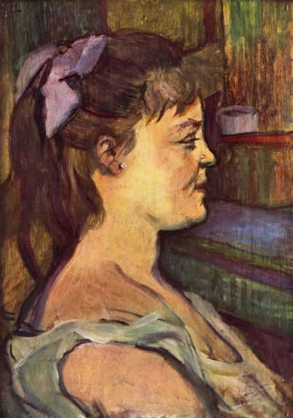 Curator: Henri de Toulouse-Lautrec's 1886 oil painting, "At Gennelle, Absinthe Drinker," captures a striking figure. What are your initial impressions? Editor: Isolation. The somber browns and the woman's averted gaze create a palpable sense of detachment, almost as if she’s been exiled from society. Curator: That feeling of alienation is effectively conveyed through Lautrec's brushstrokes. Notice the way the texture is built up – short, broken strokes that never quite resolve into a smooth, idealized form. It lends a feeling of instability, of something just slightly askew. Editor: Right, and that imperfection, in a way, humanizes her. We see so many depictions of women from this era painted to become symbols for lust or purity. But here, we get this woman caught in this hazy state, probably struggling. It makes me wonder about the real-life Gennelle and the social forces that landed her here. Curator: The composition draws the eye to her profile. The way she's positioned within the space and the angles created by her arms on the table create diagonals that imply psychological movement—as if we can witness a moment of inner conflict played out across her features. Her averted gaze draws our curiosity and emphasizes an almost introspective narrative, which diverges from mere representation. Editor: Absinthe itself also tells a story. Popular in artistic circles but also associated with addiction and societal decay, especially in depictions of working-class people. This piece invites dialogue between art and social commentary. I wonder how Gennelle found herself sitting in front of Toulouse-Lautrec and how much agency she had at all. Curator: What you say prompts contemplation of the artist’s gaze. Though Gennelle's is averted, it is Lautrec who selects the focus, creating that intimate visual experience for the viewer. It becomes an exercise of observing both the subject's position and the hand of the one choosing how she will be forever represented on the canvas. Editor: This consideration only reminds us that even within art we can find dialogues about gender and class. It goes to show how many perspectives enrich this kind of encounter!