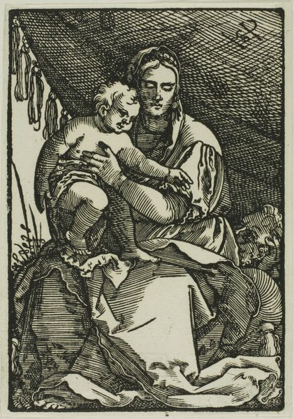 Editor: This is "Meeting of Joachim and Anna at the Golden Gate," an engraving made between 1508 and 1518 by Albrecht Altdorfer. It feels surprisingly intimate for a historical piece, like we’re catching a stolen moment. What do you find most compelling about this work? Curator: That's a keen observation. For me, it's the way Altdorfer captures the raw emotion of reunion. This wasn't just any meeting, mind you. Joachim and Anna were barren for many years and then, visited by angels, each learned they would finally conceive a child—Mary, mother of Jesus. The print, from a larger series about salvation, distills the feeling of longing fulfilled, grace received. What do you think the architecture surrounding them signifies? Editor: Well, the archway kind of frames them, putting the emphasis on their embrace. Maybe it suggests a sacred space? Curator: Precisely. The Golden Gate itself was a powerful symbol, representing entry into the sacred city of Jerusalem. Altdorfer masterfully uses line—think of the density versus the open sky—to build both narrative and emotional depth in a small format. Imagine crafting all of those tiny lines! Editor: It’s incredible. The texture adds so much, even if it's just black and white. Did many people see this piece back then? Curator: Prints were revolutionary, in a way, because they were relatively affordable and could be circulated widely. Altdorfer’s message could reach far beyond the church walls. Each impression became a sort of portable icon, carrying the seeds of faith and wonder. Isn't that amazing? Editor: It really is! I hadn't thought about how accessible prints made religious stories at the time. I’m glad you gave a broader perspective. Curator: And I learned from your insight about its initial intimate quality. It’s all about connections.