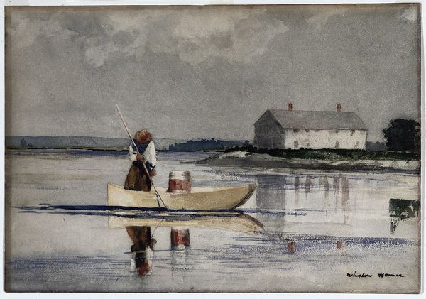 Curator: Thomas Anshutz painted "Low Tide" in 1897. It presents us with a tranquil waterscape, executed in watercolor, showcasing a solitary figure navigating a small boat. Editor: Immediately, I'm struck by the quietude. The muted colors and diffused light evoke a sense of stillness and reflection. The man in the boat, his back turned, seems like a symbolic representation of introspection. Curator: It's interesting that you key in on the introspective aspect, considering Anshutz was painting during a period when ideas about American identity were deeply tied to labor and the natural world. What connections can we make to artistic and labor practices? Editor: Well, water often signifies the subconscious. The lone boatman could symbolize a journey into the unknown aspects of self. The very pale shades amplify this, giving it the symbolism of purity of spirit and dreamlike consciousness. Curator: Considering Anshutz’s other works that explore industry and the human figure, I would say the painting challenges our understanding of his established artistic vision. Perhaps he is exploring the shifting relationship between humanity and nature at the turn of the century? What do you make of the boat? Editor: The boat acts as a vessel, not just in the literal sense, but also metaphorically, as a carrier of the self through emotional currents. Its humble form suggests a closeness to nature, a life lived in harmony with the rhythms of the sea. There is almost a religious reverence suggested by it. Curator: It is hard not to find the quiet moment powerful, considering the artist usually preferred depictions of steel mills and factories in other works. His impressionistic handling of light is a clear stylistic departure that may show an alternative vision to his established view. Editor: It's amazing how an artwork like "Low Tide" can become a mirror reflecting our own search for meaning in the mundane, the silent stories hidden beneath the surface of everyday life. Curator: Indeed. Considering the artwork’s time period and the artist, we gain insight into an important artist at odds with himself—but also with the society surrounding him.