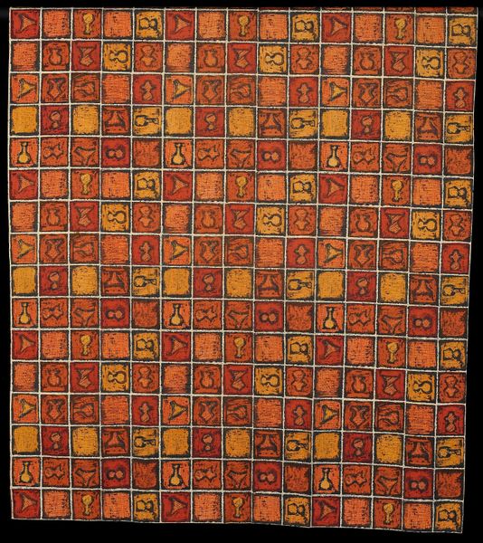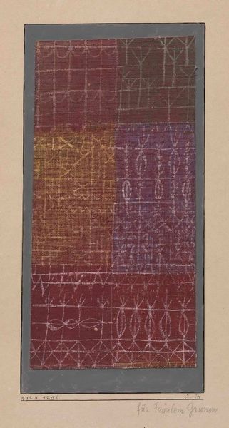 Curator: Here we have Ernst Barlach's, "The Poor Cousin" from the collection of Harvard Art Museums, of modest dimensions. Editor: It reminds me of a worn textile, almost like a faded quilt, evokes a sense of domesticity, perhaps a poignant story woven into its texture. Curator: The work is a great example of how Barlach manipulated materials to create textured surfaces, challenging traditional painting through its unique construction and patterns. Editor: It's intriguing how the pattern is replicated, almost like a repeated sigh. A sense of yearning perhaps? Curator: Understanding the social context is vital. Barlach engaged with questions of class and labor, mirroring economic disparities through the humble materiality. Editor: It also feels incredibly intimate, like a hidden diary cover, whispering secrets of survival. Curator: Indeed, Barlach invites us to reflect on production, inviting us to engage and to question the means of creation. Editor: Yes, it does linger in the mind. The texture is a tactile invitation, isn't it?