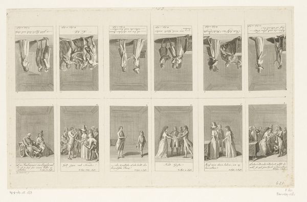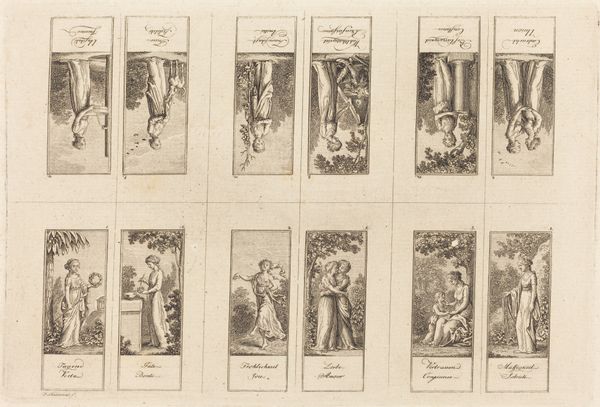 Daniel Nikolaus Chodowiecki created this print, "Twelve Examples of Natural and Affected Behavior," etching it with drypoint. Here, we see a series of contrasting images. Each pair contrasts a ‘natural’ behavior with an ‘affected’ one, revealing how society can distort genuine expression. The most arresting of these symbols is the contrast between natural, unadorned human interaction and affected or theatrical interactions. Consider the gesture of touch: In the 'natural' scenes, hands are clasped simply, conveying trust. Juxtapose this with the affected scenes, where touch becomes a performance, laden with artifice and perhaps hidden motives. This contrast echoes in ancient Roman statuary, where naturalistic poses were often idealized, yet here, the ideal is subverted, critiquing the superficiality of social performance. The theatrical gesture, seen across time from ancient drama to commedia dell'arte, becomes a marker of inauthenticity. Through these recurring motifs, Chodowiecki captures the tension between our true selves and the masks we wear, inviting us to reflect on the psychological weight of social expectations, a theme that continues to resonate in our own age.