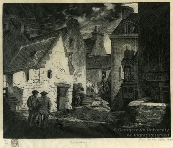 Editor: This is "View of a Mountain Village," a print made by Eugène Isabey sometime between 1829 and 1833. It’s so detailed for a print! I’m struck by how the buildings and mountains in the background seem to fade into the sky, creating a hazy, almost dreamlike effect. What catches your eye? Curator: The tonal range is certainly remarkable. Notice the strategic deployment of light and shadow across the composition. The artist orchestrates a visual hierarchy through the modulation of contrast, guiding the eye from the foreground figures, rendered with relatively high definition, to the ethereal mountainscape in the distance. Observe, also, the textures meticulously engraved – the rough-hewn stone of the buildings contrasting with the soft, undefined shapes in the sky. Editor: So, the contrast and texture create a kind of visual depth? Curator: Precisely. And what effect does the linear perspective have on your interpretation of the composition? Note the placement of architectural elements and their proportional relationship to the figures in the foreground. Editor: It creates a sense of distance, definitely. The tower on the left feels much closer than the one on the mountain. The linear perspective pushes the mountains further away while also focusing attention on the people in the village. It's interesting how the artist creates both a feeling of vastness and intimacy at the same time. Curator: Indeed. By manipulating depth and detail, Isabey constructs a compelling interplay between the immediate and the remote. This creates tension but it is all resolved in this viewing plane. Editor: I'm starting to see how much can be understood just by looking at the composition and the textures themselves. Thanks for the deep dive! Curator: My pleasure. It’s in observing such interplay that one comes to appreciate the meticulous construction of artistic meaning.