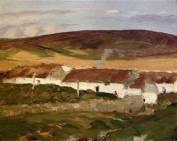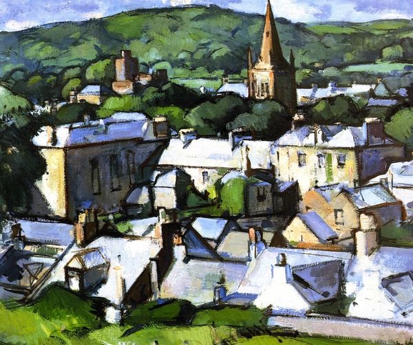 Editor: This is Samuel Peploe’s “Kirkcudbright,” an oil painting from 1916. It's a landscape, but more than that, a built landscape. The brushstrokes are thick, and the muted colors create this almost dreamlike vision of the town. What stands out to you when you look at it? Curator: I see a compelling emphasis on the materiality of paint itself. Look at how Peploe uses the oil paint not to just depict the town, but to construct it, brick by brushstroke. The visible, almost crude, application draws our attention to the labour involved in its making. This was painted during wartime; how do you think that socio-political context impacted Peploe's engagement with materiality? Editor: That’s interesting! I hadn’t thought about the labour aspect so directly. Maybe the rough, unfinished quality is a reflection of the disruption and anxiety of that time, where even something like painting would have felt very different. Do you see this in other paintings of this era? Curator: Absolutely. There’s a larger move in art during the early 20th century to acknowledge, rather than conceal, the means of production. It moves away from trying to disguise brushwork, and instead it's embraced as part of the work. What does that mean for consumption, then? How does making the material visible impact its place within art history, the market? Editor: So, it’s not just about depicting a place, but making us think about what goes into creating that depiction, too. It makes it more real somehow, by admitting its own artifice and history. Curator: Exactly. This forces the viewer to reckon with the whole economic and social fabric that surrounds art, turning landscape into something less idyllic, more deliberately crafted, bought, and sold. Editor: I’m now seeing it less as a picturesque scene and more as a document of a particular process, made within a specific context. Thanks! Curator: And I now view it with renewed interest in what other historical events, processes and cultural forces went into making it as we see it!