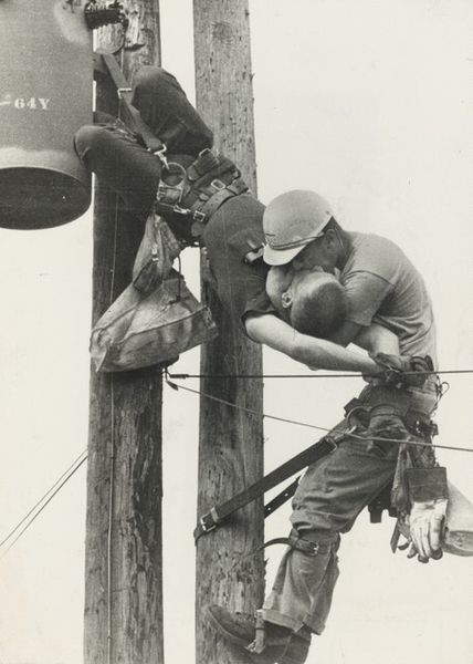 Editor: So this is Don McCullin's "High Alert, Friedrichstrasse Crossing, Berlin." The stark black and white really emphasizes the soldiers’ heavy gear. What do you see in how McCullin uses these material details? Curator: Notice how McCullin focuses on the *stuff* of war - the uniforms, the binoculars, the weapons. This material reality becomes the focal point. The photograph becomes less about individual heroism and more about the industrial processes that create soldiers. Editor: That’s fascinating! So you’re saying the *things* tell a bigger story than the faces? Curator: Precisely. These are the tools of a specific trade, the material manifestations of power and conflict, and the labor involved in this work. Editor: I never thought about it that way. Now I see how the image transforms into a commentary on the military-industrial complex.