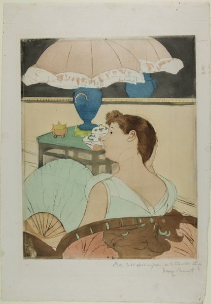 Editor: This is Mary Cassatt's "The Lamp," a print housed at the Harvard Art Museums. The soft colors and domestic scene give it a very intimate feel. What can you tell me about this image? Curator: Cassatt, a privileged American expatriate, often depicted women in domestic spaces. But let's consider whose stories aren't being told here. What about the unseen labor that maintains this quiet interior? Are we complicit in idealizing a limited perspective of 19th-century womanhood? Editor: That's a really interesting point. I hadn't thought about the absences in the image. Curator: Exactly. Analyzing what's *not* shown challenges the dominant narrative, opening space for critical discussions about gender, class, and representation. Editor: That’s given me a lot to think about. Thanks! Curator: Indeed, this is just the beginning of a deeper investigation!