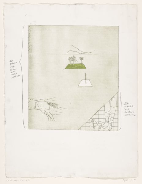 Harrie Gerritz made this print, titled Groepsportret van een legendarische omgeving, sometime in the twentieth century. The grey and white palette is punctuated with a vivid green line. It's an etching, and it has that quality of line that makes you think about process. I love the way he's organized the composition here, almost like a landscape within a landscape. The foreground is defined by that wooden fence, but then there's this little cut-out of a village scene, complete with a church steeple and little buildings, all capped off with a bright green horizon line. The texture in the grey areas feels almost like a hazy atmosphere. You can almost see the individual lines that create the tone. The relationship between the foreground and the background is so interesting, like one is protecting the other. It reminds me a little of the work of Philip Guston, especially the way he frames things and uses simple forms to create a sense of place. Art is always a conversation, right? And, like any good conversation, there are no easy answers.