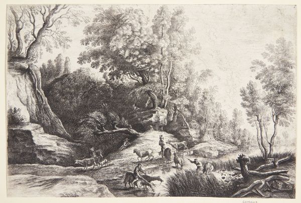 Curator: Looking at this drawing, Jan van Ossenbeeck's "Rocky Landscape" from the period of 1663 to 1674, I immediately note the strong contrast of light and shadow, a kind of stark, almost theatrical presentation of nature. Editor: Yes, it's immediately arresting. The use of etching and engraving creates this highly textural surface, all those lines working to conjure up the rough surfaces of rock and craggy plant life. It speaks to a real interest in the materiality of the world. It makes you consider the economics of moving materials to and from. Curator: The etching, especially, gives the entire composition an almost dreamlike quality. Note how the human figures are dwarfed by the immensity of the landscape. Their inclusion serves less as a focus and more to enhance the dramatic scale. Doesn’t the landscape evoke a certain sense of sublime vulnerability? Editor: It does but what kind of vulnerability did laborers experience to acquire these materials? Who was taxed, and where did these taxes lead? A "landscape" doesn't just appear as such - it requires people. People whose conditions this work would inadvertently reveal if investigated properly. Curator: Perhaps the figures' placement serves a symbolic purpose. See how they cluster together, pointing or gesturing? One could argue the positioning is to emphasize the precariousness of human existence, overshadowed by powerful natural forces, such as weather, environment, war... These craggy rocks could be metaphors for challenges. Editor: Metaphors and symbols can indeed point us to an interpretation. But this particular print would benefit from also knowing where exactly Van Ossenbeeck's materials originated to produce them and their broader appeal and potential uses, in the end. It is an engraving and etching! Did others contribute, or just him? Curator: It’s precisely these kind of inquiries which remind us that, art—as ethereal as it may appear—is also subject to physical conditions and historical moments and production circumstances! Editor: It also is shaped and made meaningful according to the hands and experiences of others who, maybe unconsciously, are implicated by it!