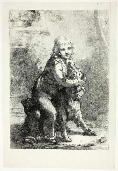Editor: This is Pierre-Paul Prud'hon's "The Boy with the Dog," currently residing at the Harvard Art Museums. I'm struck by the tenderness in this tiny image. What do you see in it? Curator: It whispers of a lost innocence, doesn't it? I feel this longing for connection, a mutual solace sought in companionship. Notice how the soft hatching almost blurs the line between boy and dog. It's like a shared dream, rendered in sepia tones of memory. Editor: So it's more than just a portrait? Curator: Oh, absolutely! It's a gentle meditation on vulnerability. The dog, usually a symbol of loyalty, is here almost a mirror to the boy's own need for affection. A tender dance of souls, wouldn't you agree? Editor: That's a beautiful way to put it. I'll definitely look at it differently now.