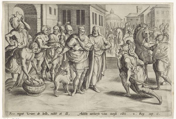 Philips Galle’s engraving depicts the anointment of King Solomon, a scene rich with historical and cultural resonance. Here, Solomon is shown kneeling, undergoing his sacred inauguration. The act of anointing, where the prophet Nathan pours oil over his head, signifies divine selection and bestowment of power, echoing ancient traditions of kingship. Trumpets blare, announcing the momentous event to the rejoicing crowd. The donkey, a symbol of humility and peace, stands nearby, contrasting with the grandeur of the occasion. This motif of anointment is not isolated; we see it echoed in countless images across time, from medieval depictions of Christ's baptism to Renaissance portrayals of monarchs ascending to their thrones. The gesture carries a primal weight, a visual shorthand for legitimacy and divine right. Like the ancient Greeks, the act of purification shown here is steeped in cultural memory. The repetition of this symbol speaks to our collective subconscious, reminding us of the enduring human desire for order, leadership, and the sacred.