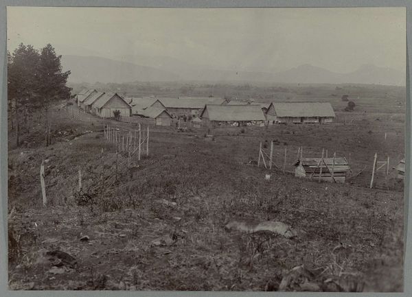 This black and white photograph, Bivak bij de Boer ni Poepandji, captures a scene of everyday life; a bustling bivouac with people, animals and architecture. The photograph plays with a range of tones, from light greys in the distant mountains, to the deep browns of the figures in the foreground. I am drawn to the way the surface of the photograph invites me to consider the history, and the story of the image itself. The details in the photograph capture a moment frozen in time. I wonder what the people in the picture were thinking and feeling as they posed for the shot. The composition of the photograph is also interesting. The huts provide a sense of depth and perspective, drawing the viewer's eye into the distance. It reminds me of the work of Bernd and Hilla Becher, who documented industrial structures with such care and precision. Like their work, this photograph invites us to consider the beauty and significance of the everyday world.