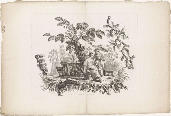 Curator: This is a print called "Chinees gezin bij een prieel met begroeiing", depicting a Chinese family in a landscape, made in 1759 by François Antoine Aveline. Editor: It strikes me as a very constructed scene, almost theatrical, with that proscenium arch of vegetation framing the figures. You can almost hear the rustle of silk. Curator: Precisely. This type of imagery reveals a European fascination with the ‘Orient’ and a demand for chinoiserie during the mid-18th century. It speaks to larger systems of trade and collecting. Notice the carefully rendered details; each object and gesture contributes to a staged sense of authenticity. Editor: But staged is the operative word, right? The execution feels distinctly European—the linear perspective, the precision of the engraving... How might the actual crafting of this work inform our reading? The labor itself feels like part of the statement. Curator: Absolutely. While purporting to depict an "authentic" Chinese scene, it's entirely filtered through a Western lens. The engraver never knew this landscape first-hand. It perpetuates and normalizes this "idea" through its very production and circulation. The print medium allowed it to reach a broad audience. Editor: And think about the materials involved: the paper, the ink, the metal plate used for engraving. These would have been sourced and circulated through a complex economic system, literally embedding the print within networks of European commerce and consumption. The object becomes a commodity in its own right, irrespective of its claim to represent something “other”. Curator: Exactly. The art market created a desire, even an illusion of access, through visual reproductions. It allowed patrons who had neither the means nor perhaps the inclination to visit these faraway lands to consume and display images from them. The image functions as a tool of cultural and class aspirations. Editor: It's all about power dynamics, really. The ability to possess and reproduce this image, and circulate that perspective of another culture, is inherently rooted in material access. Food for thought. Curator: Indeed. Reflecting on this print really underscores how visual imagery becomes deeply intertwined with socio-economic forces, often with complicated and skewed representations.