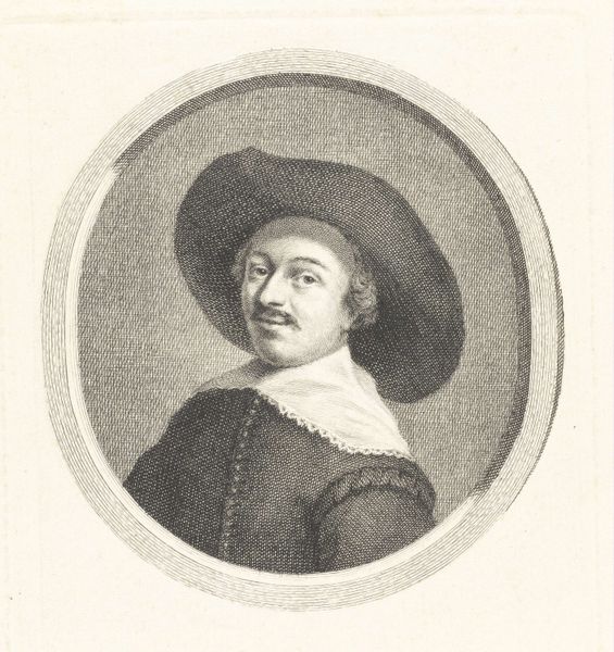 Editor: Here we have Aert Schouman's "Droevige man," made between 1720 and 1792. It's an etching, giving it this finely detailed, almost gritty quality. I’m really struck by the texture he achieves, especially in the rendering of the ruff and the man's hat. How does your perspective shed light on the production or cultural associations of this artwork? Curator: As a materialist, I see this etching primarily as an object produced within a specific network of resources and labor. Schouman's choice of etching as a medium immediately brings up questions of reproducibility and distribution. Who was the target audience for such prints? How would this image be circulated, and what economic factors governed that process? We can also ask: what social meanings do the specific details in this piece embody? The clothing, for instance, suggests certain class aspirations, but how might this be disrupted or reinforced by the caricature-like treatment of the subject? Editor: That's fascinating. So, it's less about the individual portrayed and more about what the object itself signifies within its societal context. Do you think the medium contributes to this "sad man’s" story? Curator: Absolutely. The very act of etching, a process demanding precision and skill, speaks to a specific kind of labor. Also, we might see the 'sad man' as a commodity himself, his likeness reproduced and sold within a developing market for images. Where did Schouman acquire his materials, and what were the working conditions like in his studio? This helps reorient our reading away from a sentimental focus on the subject’s apparent emotions and towards an investigation of the systems that produced him as a representational figure. Editor: This definitely gives me a lot to think about regarding art’s production and consumption in the 18th century! Curator: Exactly. It compels us to think critically about the artwork as more than just a visual representation; it's a product of its time, embedded in complex social, economic, and material realities.