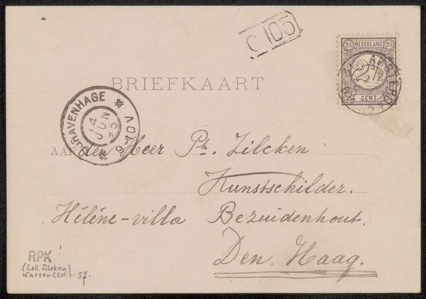 This 'Briefkaart aan Philip Zilcken' was composed without a date by Thérèse Schwartze. Look closely, and you'll notice the postal markings, a circle enclosing the date and location, and the stamp, emblems of bureaucratic authority, each carrying symbolic weight. These stamps and seals—they remind us of ancient signet rings used to validate documents, symbols of power and authenticity. The circle, seen here in the postmark, echoes through history from early cosmological charts to halos in religious iconography, representing completeness, eternity, and divine protection. Consider how the act of sealing, stamping, and sending a letter, embedding it with symbolic assurance, engages the viewer's subconscious. It taps into our collective memory, stirring primal urges related to validation and acceptance. Each character, each stamp, is a coded message, evoking intense feelings associated with communication and authority. The circulation of letters mirrors the cyclical nature of human communication itself, resurfacing and evolving, carrying new meanings across time.