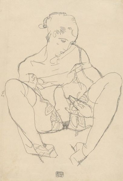Editor: This is Hermann Lismann’s "Crouching Nude," we don’t have the exact date for it, but it’s a charcoal drawing. It's really quite a striking image. What underlying cultural themes do you see in this piece? Curator: Note how the figure avoids our gaze, caught in a private moment, almost ritualistic. The act of tending to oneself is laden with cultural meaning. What does this intimate moment evoke for you? Is it vulnerability, contemplation, or perhaps something else? Editor: I see a little of all of that! It really makes you consider ideas about femininity. Curator: Exactly! And femininity, as an archetype, carries a heavy weight of societal expectation. The image then becomes a space for examining those expectations. Editor: That’s given me a lot to think about in terms of the symbolism of the female figure. Curator: And for me, it's highlighted the beauty of the mundane.