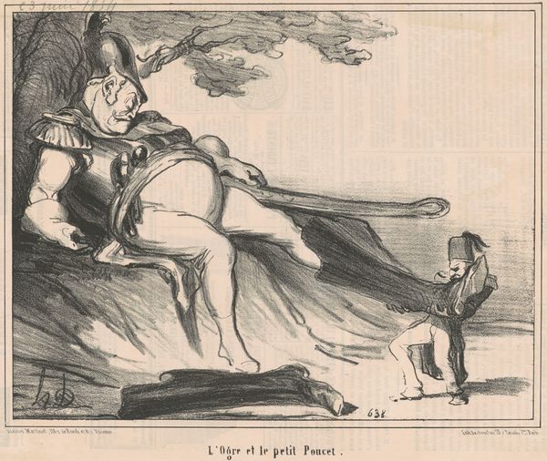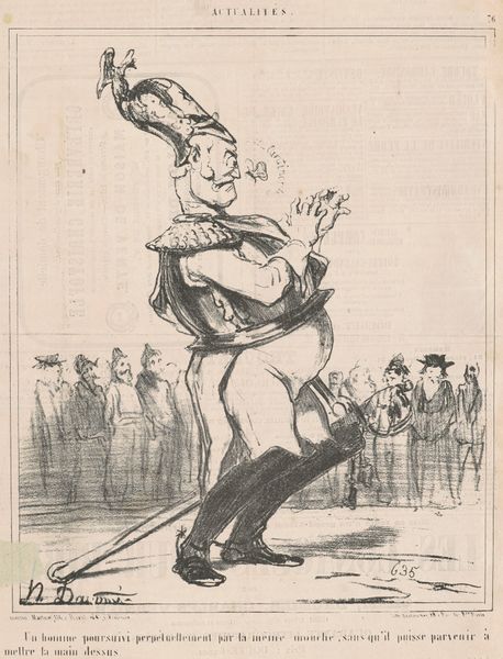 Curator: Honore Daumier’s lithograph, "Ayant attrapé un coup de soleil," or “Having Caught a Sunstroke,” likely dates to the mid-19th century. It’s a monochrome print featuring two military figures in exaggerated poses. Editor: It certainly grabs your attention! The dynamism in their movement, despite being static, is impressive. The cross-hatching adds depth, but the men are still rather grotesque. There is something very dark about it. Curator: Grotesque is an apt term. Daumier employed caricature frequently in his prints to lampoon the bourgeoisie and political figures of his time. The exaggerated features are a crucial component of his social critique. Editor: Indeed. The artwork immediately brings to mind the socio-political milieu of 19th-century France. Were these specific generals, or rather types? Their theatrical stance feels… performative of power rather than actually powerful. Curator: Good eye. I would contend the rigid military garb and posturing satirize the vanity of militarism itself. The men are puffed-up figures; it feels very stagey. Editor: So, in this period, this type of work might appear in news periodicals and satirize social structures? And that may influence this style with exaggerated movement and exaggerated, let's call it, “gestures”. Curator: Precisely. The accessibility of printmaking allowed Daumier to disseminate these commentaries widely and cheaply. Editor: That context casts new light on the work. It shifts from a crude image to a cunning, democratic tool to inform the public, revealing underlying ironies in authority. It is more poignant that way, isn't it? Curator: The technical virtuosity with which Daumier manages to communicate such pointed social commentary via a cheap, reproducible format really exemplifies the revolutionary potential of print media. Editor: It truly showcases the potent combination of art, technology, and social observation. Curator: Yes, it urges us to look beyond the surface—beyond the bold lines and shading to perceive its profound and satirical commentary on power and society. Editor: And for all the apparent chaos of the line work, a clear and unflinching vision of Daumier’s view emerges.