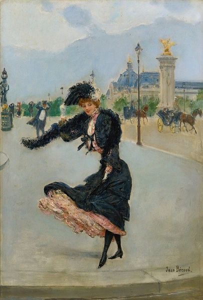 Curator: Today, we’re looking at Jean Béraud’s "Parisienne sur la place de la Concorde," painted in 1885. The artwork rendered in oil paint embodies impressionist aesthetics and shows a woman with a present walking along the streets of Paris. Editor: My first impression is the artist's skilled capture of a crisp, possibly cold, Parisian day. There is a prevailing gray tonality to the painting and this is sharply contrasted by the striking figure in black, poised centrally. She cuts a sophisticated, albeit slightly mournful figure across the scene. Curator: Precisely. Béraud's strength here is his manipulation of light and color. Notice how the limited palette actually enhances the central figure? It directs the viewer's gaze and then encourages it to travel around the city scape and interact with the structural composition and perspective of the setting. Editor: It’s more than visual arrangement though; this woman embodies the rapid social changes of the era. She represents a modern, urban woman navigating a transformed Paris. What does it mean for her to move through the city alone, carrying a gift, in a period marked by both opportunity and oppression for women? I notice that even the city seems to loom up and impose over her figure in a disorienting manner. Curator: An intriguing point. You suggest that the backdrop hints at her potentially compromised situation. Alternatively, consider the meticulous detail in her attire, contrasted against the blurred, indistinct figures in the background. This contrast emphasizes her status and individualism; highlighting how this visual strategy elevates her as a subject of artistic merit. The semiotics here construct and reflect high society values in the Parisienne. Editor: Yet the gaze of this stylish woman directly engages with the viewer; what's on her mind and who is she in relation to other women represented in painting? In light of Baudrillard’s writing, her presence seems highly self-aware; acutely alert to being seen and therefore a symbol for performative feminine identity within the urban arena. Her clothes embody her agency. Curator: A powerful lens through which to view the piece. Ultimately, it demonstrates how Béraud's work, rich in detail and nuance, continues to generate meaningful discourse regarding structure and representation in nineteenth-century art. Editor: Indeed, this artwork gives insights into intersectional discourses around gender, society and location. "Parisienne sur la place de la Concorde" prompts us to see a woman, perhaps compromised, on the cusp of a brand new era.