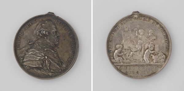 Curator: What an interesting piece. This medal, dating from 1756, commemorates the surrender of the Saxon army to Frederick II of Prussia at Pirna. It's currently held at the Rijksmuseum. Editor: It feels incredibly formal and a bit…cold, even for a military scene. The relief work looks quite precise, but the overall effect is of calculated power, not human drama. What material is it? Curator: It is metal. Likely silver, given its sheen and the time period, though further analysis would be needed for confirmation. Consider how the choice of material reinforces its purpose – medals, typically of precious metals, were designed as permanent testaments to significant events. Editor: Precisely. And this is a top-down, totalizing kind of power, isn't it? The scene almost feels like a factory-line submission, less about courageous opponents surrendering and more about industrializing domination, freezing that single point of surrender forever. This raises a point about the labour and resources pumped into immortalising a single act, and perhaps, Frederick's obsession with consolidating imagery, Curator: That’s an interesting point. There is definitely a calculated sense to it. We see Frederick celebrated on the one side. Turn it over, and we have that very staged submission – complete with allegorical figures overseeing the event. It very pointedly promotes Prussian strength, with Johan George Holtzhey carefully aligning himself to the socio-political objectives. Editor: And the repetitive, almost stamped figures of the surrendering army reinforce this idea. The uniformity suggests an almost dehumanized submission, a mass-produced subjugation. Curator: Exactly. A commentary on craftsmanship and ideology; these medals also had an impact on everyday citizens as they would carry and handle this symbol, which in turn reinforced power relations within society. The tactile, replicable object serves as a potent form of propaganda. Editor: Yes. I think my lasting impression of it is the complete management of narrative – using the laborious crafting of metal to control and disseminate a very specific message. Curator: Agreed. It reveals much about the era's approach to both commemorating and manipulating historical events.