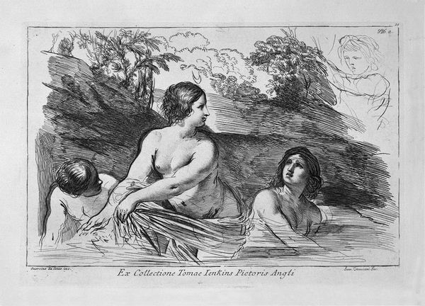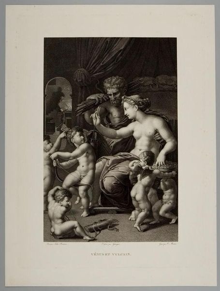 Editor: This is "Venus and Mars" by Giovanni Battista Piranesi, an etching and engraving. There's something so intimate, almost domestic about it, despite the grand mythological theme. Venus is lounging in bed while Mars is removing his helmet. It’s quite striking. How do you interpret this work? Curator: Intriguing. This piece carries echoes of both power and vulnerability. Notice how Venus, goddess of love and beauty, is disarming Mars, the god of war. The helmet becomes a potent symbol here, representing not only warfare but also the masculine identity that Mars momentarily relinquishes. Does the placement of Cupid near Venus change your sense of its themes? Editor: Absolutely, Cupid complicates the scene. He's the god of desire, but he’s also associated with irrationality and even blindness. Curator: Precisely! His presence subtly underscores the complexities of love and its capacity to both temper and inflame even the mightiest warrior. Consider the art historical context: what are your associations when you think of antiquity as an art movement? Editor: Thinking of ancient works makes me consider ideals of beauty and form. And here, I’m particularly drawn to how Piranesi is grappling with ideas about beauty, peace, and power in a way that subverts traditional gender roles. Curator: An excellent observation. In that vein, what do you make of Venus taking Mars’s helmet, while a bare-bodied Cupid idly relaxes? This piece is loaded with suggestions about which power—beauty or brawn—triumphs in domestic life. And by extension, in history. Editor: This has certainly made me see it differently, less as a simple mythological scene and more as a commentary on power dynamics and the taming effects of love. Thank you! Curator: Indeed. By studying such a complex weave of iconography, we find Piranesi may be exploring something universally and enduringly human: that even gods can be humbled by love.
