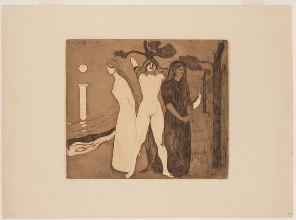 Curator: Here we have Koloman Moser’s etching titled "November," created in 1902. What are your immediate impressions? Editor: Stark and somber. The muted palette and looming figures evoke a distinct feeling of melancholic introspection, a sense of waiting. It's compelling. Curator: Indeed. Considering its creation during the Vienna Secession movement, Moser was interested in uniting fine art with applied arts. He often explored the simplification of form and function across various media. The etching process itself, biting into the metal plate, allowed for such striking contrasts and textures we see here. The labor is so apparent. Editor: And those contrasts are central. Notice how the stark white faces peek from the darkness. Semiotically, white often suggests purity or a blank slate, sharply contrasting with the cloaked anonymity of the figures. The artist also cleverly uses a vertical rectangular element in the background, countering and reinforcing the figural masses. It balances and intensifies the composition. Curator: Speaking of figures, it makes me consider who they are representing and their social standing. Their heavy cloaks obscure any individuality; the figures become emblems of the season itself. They seem to be heading somewhere; it gives the viewer the sense of seeing individuals at a given moment within an ordinary scenario of pre-war Vienna. The means of production were accessible, allowing for wider distribution, potentially reaching the working and middle classes. Editor: Fascinating point about accessibility. I would also add, speaking from purely visual terms, that the linearity achieved by the artist heightens the artwork's symbolic power. The lines add both literal and psychological dimensions. The use of perspective and the varying depths add to the emotional pull as well. Curator: So, in "November," Moser gives us an artwork deeply rooted in the techniques and social influences of its time. It challenges us to look past the immediate gloom to the production, materiality and labor of an artwork that democratizes fine art practices and processes. Editor: Yes, and aesthetically, we see an ingenious manipulation of formal components that invites an emotional and intellectual experience of isolation and introspection. A powerful expression encapsulated in form.