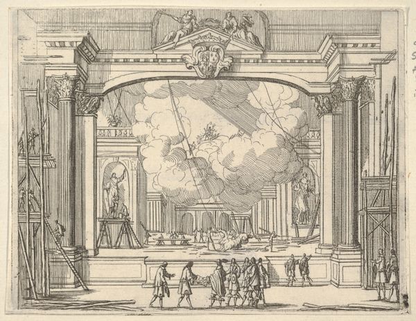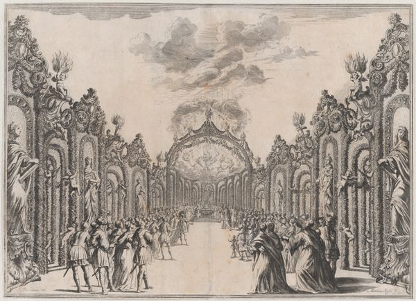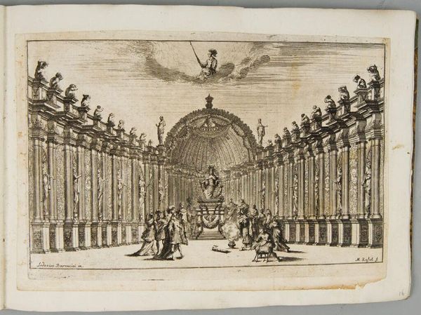 Mathäus Küsel made this print of a stage design for 'Il Pomo D'Oro', an opera performed in Vienna in 1667. The image depicts an elaborate architectural setting, with people worshipping a statue of an armed figure. This print offers insights into the cultural and political context of 17th-century Europe. The design’s grandeur reflects the opulence of the Habsburg court, a major patron of the arts. The opera itself, and therefore this set, would have been a display of power, intended to impress both local audiences and visiting dignitaries. The act of worship depicted here blends classical and baroque elements, with the statue of the armed figure evoking both ancient Roman deities and contemporary military might. The presence of mythological figures, combined with symbols of imperial authority, underscores the opera's function as a form of political theater. By examining prints like these, alongside historical accounts and musical scores, we can begin to understand the complex interplay between art, power, and society in the early modern period.