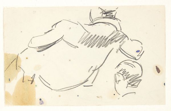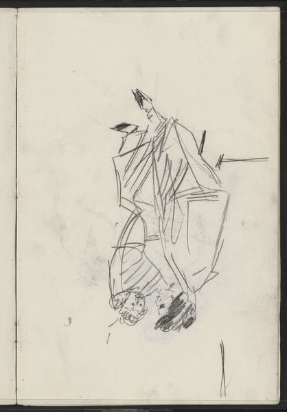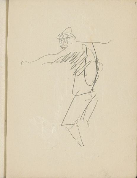 Curator: Edvard Weie's pencil drawing, "Studie af maleren Kristian Kongsbøll (1880-1913), siddende," dating from between 1910 and 1913, presents a captivating glimpse into artistic collaboration. Editor: Right, what immediately grabs me is this sense of captured thought—he's there, he's sitting, but his energy is directed somewhere completely internal, y'know? It's very intimate, almost voyeuristic. Curator: Indeed. The sketch's brisk, economic lines seem less focused on pure mimesis, more concerned with something about formal positioning. There is a stark contrast between rendered line and open space. The sitter's pose exhibits the visual dynamic, offering, from a formalist perspective, an intriguing interplay of positive and negative areas on the page. Editor: And it's those almost-unfinished lines, isn't it, that amplify that feeling? It is like Weie is capturing a moment so fleeting that too much detail would kill the feeling. I almost imagine Kongsbøll lost in thought about his last exhibition. You sense so much character despite how sparse the marks on paper are. The economy, ironically, communicates plenty. Curator: Precisely. Consider, too, the positioning. The eye is drawn by subtle suggestion to discern. There's a complex yet subtle triangulation that structures the composition, wouldn't you say? From the head down through the suggestion of his shoulders and posture to the feet at the bottom— the architectonics, so to speak, create an immediate, self-sustaining visual tension. Editor: Sure. It’s just lovely. I like to think these sketches function not as simply preparatory, but more like records of shared, creative headspace. It's this conversation frozen in time. A great insight into these guys and their work together. Curator: Well, whatever the spirit animating Weie, what stands is that, structurally, the portrait accomplishes its purpose via considered design and attention to shape over realism. The drawing presents the viewer with questions regarding figuration and presence. Editor: Ultimately, these little glimpses have the power to transform how we see everything. Curator: Indeed. A modest pencil sketch from a moment long since gone… But we carry on discussing it still.
