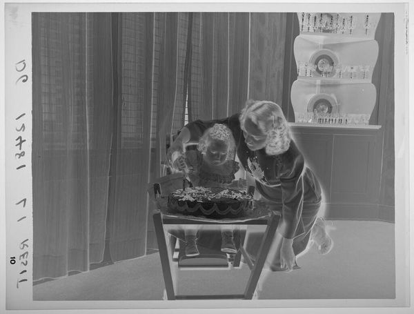 Editor: This photo by Martin Schweig, titled "Untitled (mother reading to young son and baby girl on floor of living room)," presents an intimate scene. What stands out to me is how the photograph itself functions as a material object, almost like a document of domestic labor. What do you see in this piece? Curator: I agree. Notice the physical evidence of the photographic process itself – the edges, the notations. These elements remind us of the labor involved in image-making, connecting it to the broader context of production and consumption within the family unit. The mother's act of reading becomes another form of labor, shaping the children's world. Editor: So, it’s less about the idealized image of motherhood and more about the means by which that image is constructed? Curator: Precisely. It highlights the social and material conditions that shape our understanding of family and domesticity. Editor: That gives me a completely different appreciation for the work.