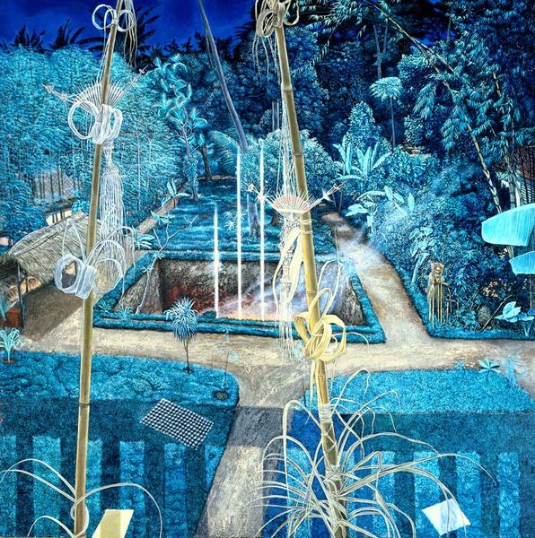 Editor: Here we have "The Star", an oil painting by Sven Jonson. It's difficult to pin down a date for it, but the geometric abstraction mixed with that touch of romanticism gives it a rather dreamlike quality. What strikes you about this painting? Curator: I'm drawn to how Jonson uses geometric shapes to almost fracture the landscape, inviting us to question conventional perspectives. What is this 'star' they're referencing? Is it a literal star, or does it function as a symbol within a larger narrative? Consider how landscapes in art have often been used to reflect social and political ideologies. Does this stylized scene comment on humanity's place within a rapidly changing world, perhaps reflecting a longing for guidance or a fear of the unknown? Editor: So the fragmentation could be more than just a stylistic choice – it could reflect societal anxieties? Curator: Exactly! The cool color palette and sparse figures create a sense of isolation. Think about the historical context: Sweden during the 20th century experienced significant social and political shifts. Might this scene be a visual metaphor for those seeking a new path forward, navigating a world reshaped by industrialization and war? What emotions does it evoke in you? Editor: I initially felt a sense of peace, but knowing the history makes it feel a little more…unsettling. There's definitely an element of uncertainty to it. Curator: I agree. And look at how the figures, while present, are almost swallowed by the vastness of the geometric space. Are they searching? Lost? It’s not giving answers. Editor: It’s made me think differently about how art can reflect a nation's mood during times of transformation. Curator: Precisely! Art doesn’t exist in a vacuum. "The Star" is less about depicting a literal scene and more about exploring the symbolic landscape of the human psyche.