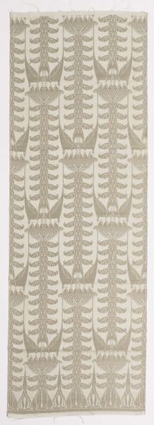 Curator: Looking at this piece, I'm immediately struck by its delicate, almost ethereal quality. The pale yellow is just lovely. Editor: This is "Staal bespanningsstof van linnendamast met dessin van zwaluwen en bijen"—roughly translated as "Sample of linen damask upholstery fabric with a design of swallows and bees"—created by Chris Lebeau between 1911 and 1915. It resides here at the Rijksmuseum. Curator: Upholstery fabric, you say? It has such a decorative but light touch for something so utilitarian. It really plays with positive and negative space. Editor: Well, consider the Arts and Crafts movement influencing Lebeau’s work, there's a deliberate elevation of craft to the level of fine art. This was produced, of course, in an era defined by growing industrialization. Damask weaving itself is a complex process, demanding highly skilled labor and specialized looms to produce the intricate, reversible patterns. Curator: Reversible patterns. That speaks volumes about design and utility and… almost challenges this high/low art dichotomy, right? I am interested in the interplay of repeated geometric structures, punctuated by those subtle figural elements. The eye constantly refocuses, trying to grasp a singular focal point, but there's no resolution, no definitive figure. Editor: Indeed! The swallows and bees act as subversive elements. The core design, created with linen, subtly invites reflections on the work and lives of artisans crafting textiles amid factory settings. Were these items made to promote the local beekeepers in the region, the local birdwatchers, the Arts and Crafts Society… It's hard to pin down exactly the motivation but they must have surely made their money back considering these fabrics became so very popular. Curator: So, beyond the aesthetic and repetitive allure, there's this embedded commentary on labor and consumption that pushes this from just 'decorative' into something much deeper. What do you think Lebeau, with this damask sample, hoped to convey or maybe provoke? Editor: Maybe just a reminder of the beauty in the everyday, and value in skilled labor... Curator: I like that thought! I do have to wonder now where it was first seen—how it sat and felt on those long-ago chairs.