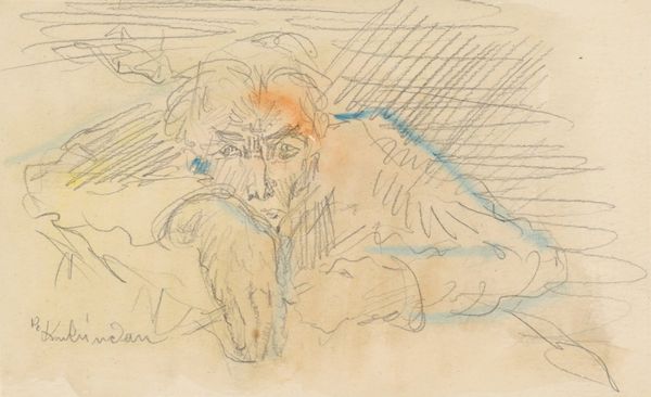 Editor: This is “Untitled 20,” a drawing by Edvard Munch, done with pencil and colored pencil. It's quite abstract, but I perceive a figure hunched over. What strikes me is its rawness – almost like a fleeting thought captured on paper. How do you see this piece? Curator: It’s fascinating how even in what seems like a simple sketch, Munch embodies the angst that defined his era. Considering the socio-political climate of the late 19th and early 20th centuries, the rise of industrialization and shifting social structures, one could see this hunched figure as symbolic of alienation, a common theme amongst artists grappling with modernity. Do you see any hints of social commentary here, given the institutional role art played at the time? Editor: I can see how it might reflect a sense of unease related to social upheaval. But it feels so personal. The colours almost vibrate with intensity. Is it possible it’s just about inner turmoil rather than commenting on wider society? Curator: It’s definitely both, and that duality is important. Munch often intertwined personal experience with broader anxieties. Expressionism, as a movement, certainly saw the personal as inherently political. Consider how galleries and critics would have viewed and perhaps even commodified these expressions of raw emotion. That impacts the work's public meaning. The 'Untitled' nature also adds to that reading, doesn't it? It refrains from leading us down a single, easy interpretive path. Editor: That's a great point! The lack of a title definitely broadens its possible interpretations. It really makes you think about how society and the art world shape what we see, even in something so seemingly private. Curator: Precisely. It highlights how much the reception of a work depends not just on the artist's intent, but the surrounding cultural dialogue. Seeing it this way helps me consider its role within art history. Editor: I will never be able to look at a simple sketch the same way! This opened up some great perspective. Thanks!