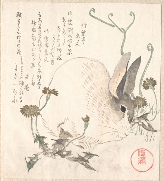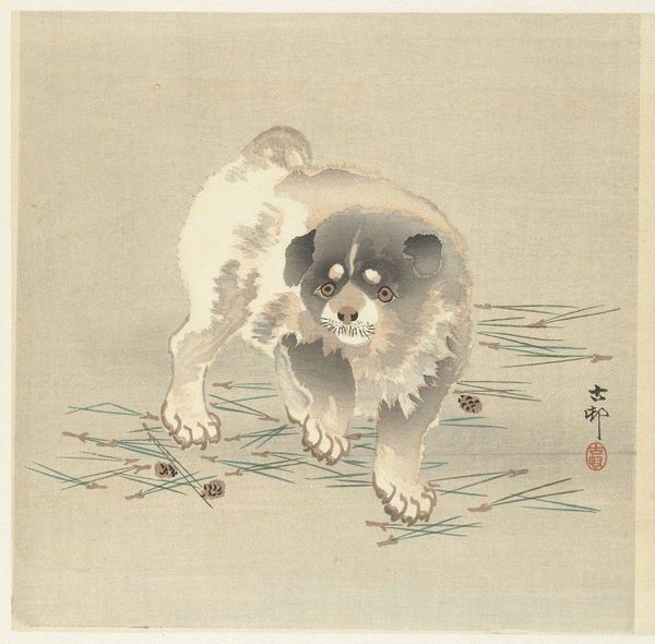 Curator: Looking at Kawabata Gyokushō's "Cat Seen from Behind," made between 1887 and 1892, currently residing here at the Met, what captures your eye? It’s an ink and watercolor piece, quite minimal in its approach. Editor: Well, the first thing I notice is this arresting sense of feline drama, somehow captured simply through the cat's posture and the texture of the ink wash. It's incredibly evocative. Curator: Indeed. Consider the materiality; Gyokushō wasn’t necessarily trying to capture some inherent essence of “catness,” but was instead exploring what he could achieve through specific manipulations of ink and brush on paper. The social context of Ukiyo-e printmaking also likely influenced his process – the repetition, the flat planes, and the elegant linework are a continuation of its influence. Editor: I agree, and it's more than just the materials. Look at how Gyokushō presents this cat. From behind, yes, but with ears perked, maybe alert or irritated; those subtle clues give it character. In many cultures, the cat is a multifaceted symbol, a blend of independence, domesticity, and perhaps even a touch of the uncanny. It mirrors those symbols, doesn’t it? Curator: Precisely, and that tension inherent to the work stems from Gyokushō embracing traditional techniques and familiar subject matter while subverting expectations through his abstraction and composition. His materials, in other words, are vehicles for a broader engagement with both his cultural lineage and his artistic peers. We should remember he worked in a quickly industrializing Meiji-era Japan and he needed to decide if he would hold on to tradition, or move ahead to more modern approaches. Editor: A tension well-wrought. This single feline form manages to reflect this turning point between Japanese tradition and rapid modernization! Curator: It speaks volumes about the changing artistic landscape, even through something seemingly as simple as a cat’s back. A great thing to think about next time you are looking at "Cat Seen from Behind." Editor: Absolutely. An image to linger over.