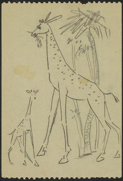 Curator: What a striking piece. We’re looking at "Giraffe" from the Quadrupeds series, created in 1890 by Allen & Ginter for their cigarette cards. It employs colored pencils and print techniques. Editor: It feels so innocent. There’s something almost naive about the rendering of the giraffe and its surroundings. It's very quaint and old-fashioned in a comforting sort of way. Curator: The symbolism here is quite interesting when we think about the context. Consider the giraffe itself – it's an animal of considerable grace, elegance and a symbol of far-reaching vision, elevated perspective, awareness, individuality and intuition. In African cultures, the giraffe also possesses shamanic power as a harbinger. Now imagine receiving this miniature symbol of wisdom along with a cigarette, back in 1890. Editor: Yes, a miniature window to the natural world tucked in with something as quotidian, and eventually dangerous, as a cigarette. I see it as a blatant advertisement, obviously. A tool of late-19th-century consumer culture designed to sell tobacco while simultaneously conjuring images of exotic lands and animal nobility, to normalize a highly addictive habit. Curator: It’s definitely both. But isn't it also revealing of a shift in perception? People were becoming increasingly disconnected from nature with growing urbanization, and images like these could evoke a sense of wonder, a connection to something primal, through these easily disseminated symbols, and therefore cultural memory. Editor: Perhaps, but I still believe it functions as a very calculated element of branding and imperialism. "Buy our product, expand your horizons." And whose horizons were really being expanded by exploiting both land and wildlife in colonized territories? Where did Allen & Ginter harvest tobacco and print these cards? It speaks to the inequalities deeply embedded within the seemingly innocent aesthetic. Curator: These contradictions exist simultaneously, that’s for sure. The print, though small, reminds me of larger tapestries depicting hunts, yet this has an almost fable-like sweetness. Editor: I’ll grant you that, and seeing this artwork displayed now invites reflection on consumerism, exploitation, our relationship with the environment. A bittersweet reminder of our history and our continuing struggle for ethical consumption and equitable representation. Curator: For me, the staying power of the Giraffe is that even reduced to a commodity, a small printed symbol, its wild dignity is evident, sparking the possibility of something beyond the card itself.