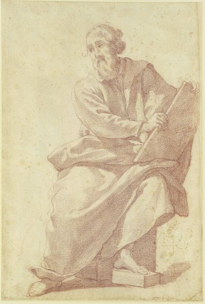 Here is a drawing of Saint Luke the Evangelist, made by an anonymous artist. The drawing's composition draws us in, focusing on the detailed rendering of Saint Luke holding a quill. The soft browns and creams create a gentle, almost dreamlike quality, while the darker lines add depth. The figure of the saint is juxtaposed with the symbol of the ox behind him. The lines, expertly applied, define not just the form, but also the very essence of the subject. The interplay of light and shadow brings a sense of movement to the folds of his robe and the fur of the ox. The visual language employed here—the careful construction of form through line and tone—invites us to consider the structural elements that uphold meaning. The drawing stands as a testament to the enduring power of form, line and composition.