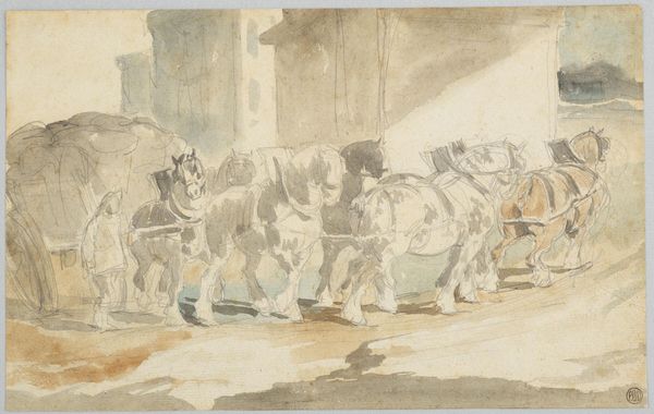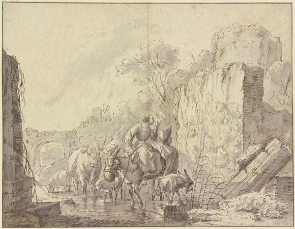 Johann Heinrich Roos made this ink and wash drawing of a herd crossing water in the 17th century. The artwork’s appearance is deeply influenced by the fluidity of the ink medium. Roos skillfully uses washes to create depth and volume, capturing the textures of the animals’ hides and the ruggedness of the landscape. You can almost feel the weight of the figures on horseback, and the relative lightness of the livestock wading through the water. The drawing’s monochrome palette evokes a sense of antiquity, aligning it with classical pastoral scenes. However, the subject matter – the everyday labor of shepherding – also connects it to the realities of rural life. Roos's work challenges traditional distinctions between high art and craft, elevating the depiction of labor through skilled drawing and a keen understanding of materiality.